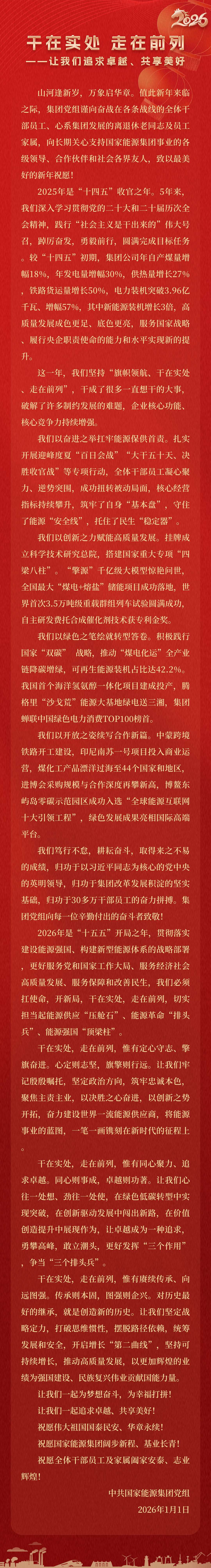 國家能源集團(tuán)胸懷“國之大者”,增產(chǎn)增供、穩(wěn)價穩(wěn)市,積極服從服務(wù)國家戰(zhàn)略、保障國家能源安全、助力國民經(jīng)濟(jì)穩(wěn)增長,推動煤炭安全綠色智能、煤電清潔高效穩(wěn)定、現(xiàn)代煤化工高端多元低碳、運輸物流協(xié)同一體、新能源多元創(chuàng)新規(guī)模化發(fā)展,全力擔(dān)當(dāng)能源強國頂梁柱,能源供應(yīng)壓艙石,能源革命排頭兵。